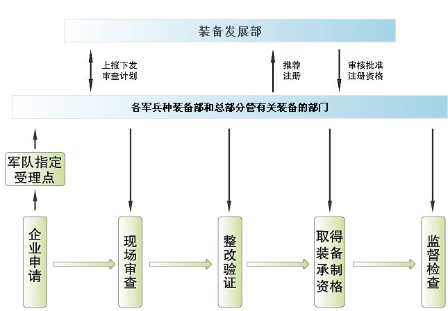 裝備承制單位資格審查申請(qǐng),原則上按照現(xiàn)行駐廠軍事代表管理體制,由駐廠軍事代表 機(jī)構(gòu)負(fù)責(zé)受理。沒有派駐軍事代表的,由主要采購(gòu)單位受理。經(jīng)各軍兵種軍代局同意后報(bào)總裝備部綜合計(jì)劃部批準(zhǔn),由各軍兵種軍代局組織實(shí)施。